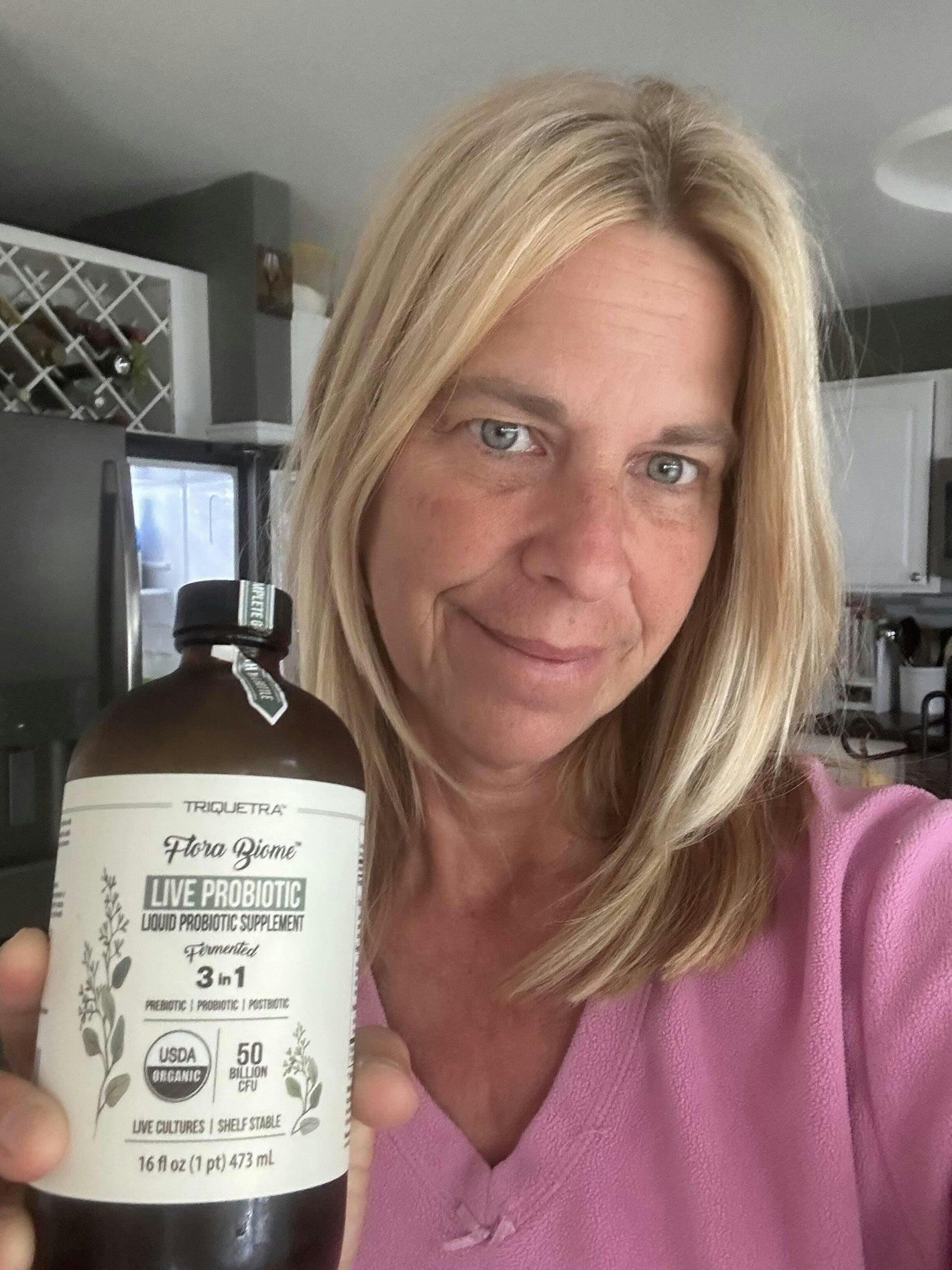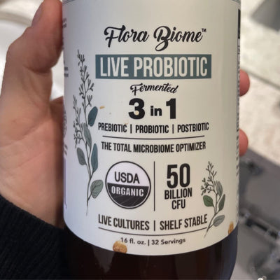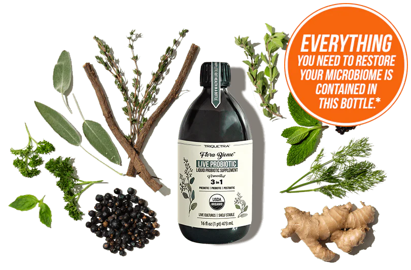 Flora Biome is a 3-in-1 liquid probiotic formula that combines prebiotics, probiotics, and postbiotics to support gut health, digestion, and overall wellness. It contains 10 probiotic strains and 18 fermented herbs to promote a balanced microbiome.